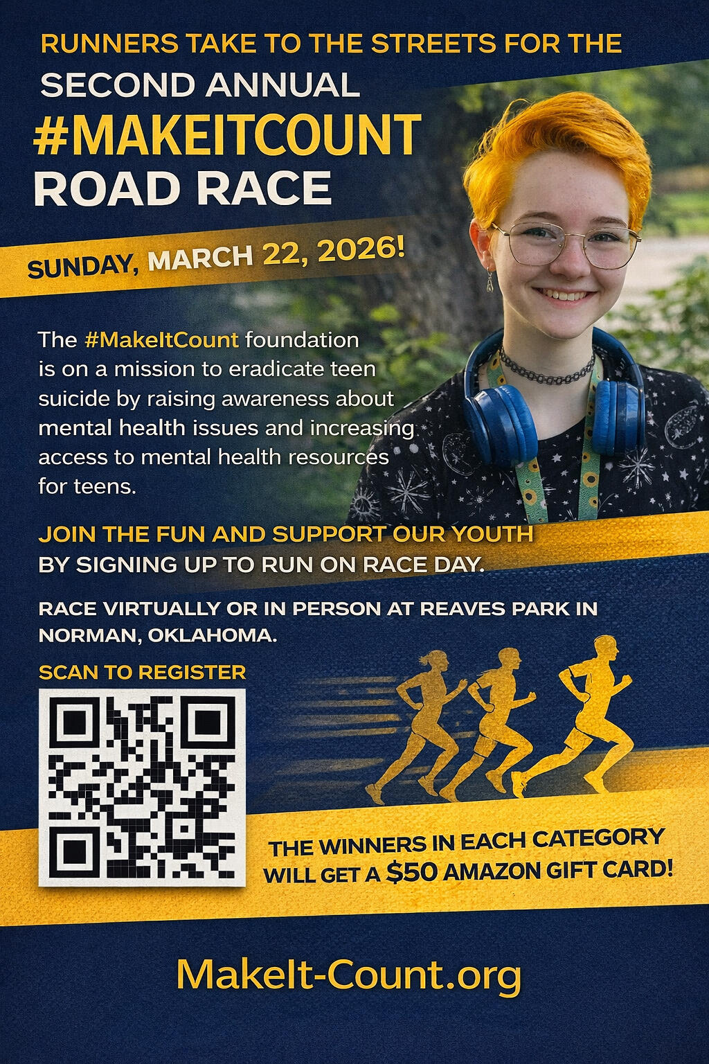 Runners take to the streets for the Second Annual #MakeItCount Road Race on Sunday, March 22, 2026!The #MakeItCount foundation is on a mission to eradicate teen suicide by raising awareness about mental health issues and increasing access to mental health resources for teens.Join the fun and support our Youth by signing up to run on race day.Race virtually or in person at Reaves Park in Norman, Oklahoma.The winners in each category will get a $50 Amazon gift card!This year our financial objective is to officially organize as a 501(c)(3) organization and begin operating! We appreciate your support!